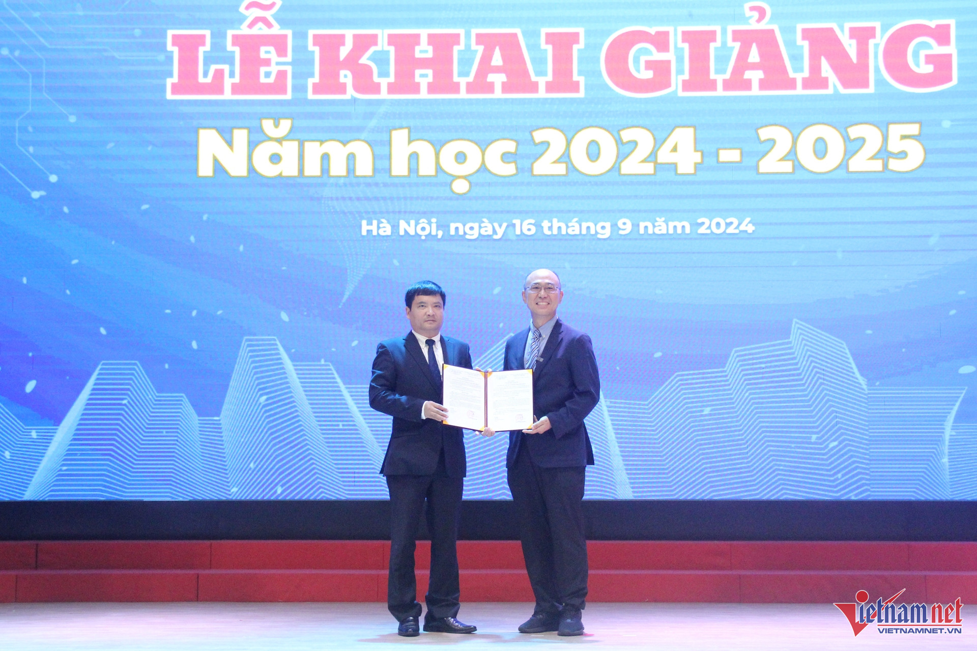 Giám đốc PTIT Đặng Hoài Bắc trao quyết định thành lập Ban hợp tác đào tạo hội tụ ảo cho Giáo sư Jong Hyun Wi, đồng Trưởng ban. Ảnh: T.A
