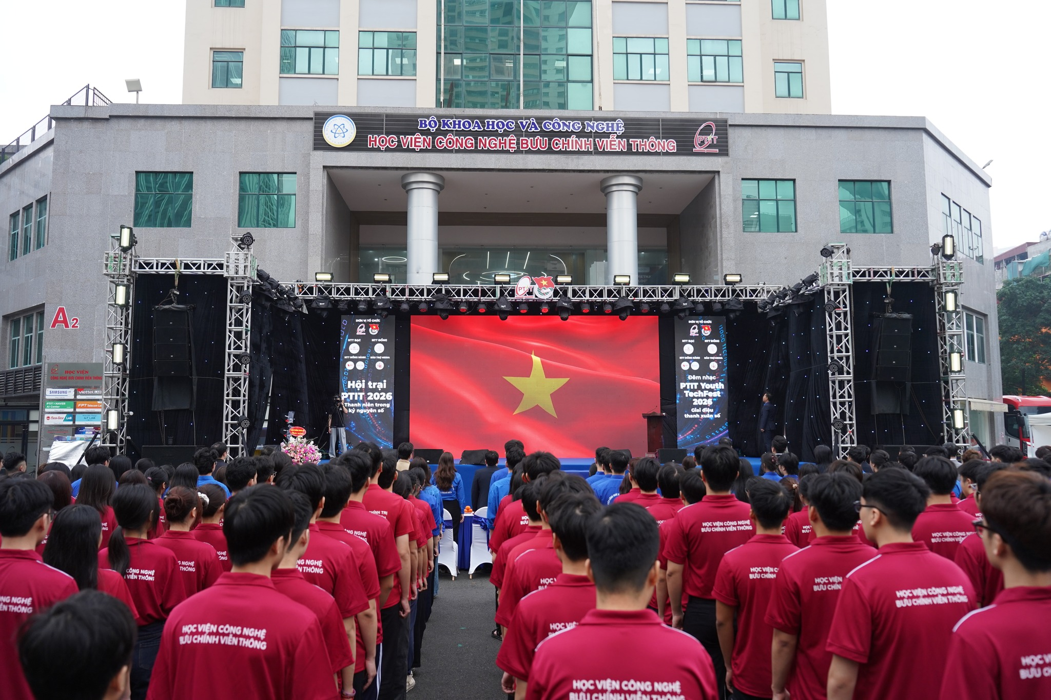 Cao điểm của Tháng Thanh niên diễn ra vào ngày 23/3 với chuỗi hoạt động nổi bật. Trong đó, lễ chào cờ đặc biệt đã để lại dấu ấn sâu sắc khi hàng trăm đoàn viên, sinh viên cùng nhau hát vang Quốc ca, Đoàn ca trong không khí trang nghiêm, tự hào. Hình ảnh xếp chữ “PTIT” và số “95” thể hiện tinh thần đoàn kết, sự đồng lòng của tuổi trẻ Học viện hướng tới kỷ niệm 95 năm Ngày thành lập Đoàn TNCS Hồ Chí Minh.