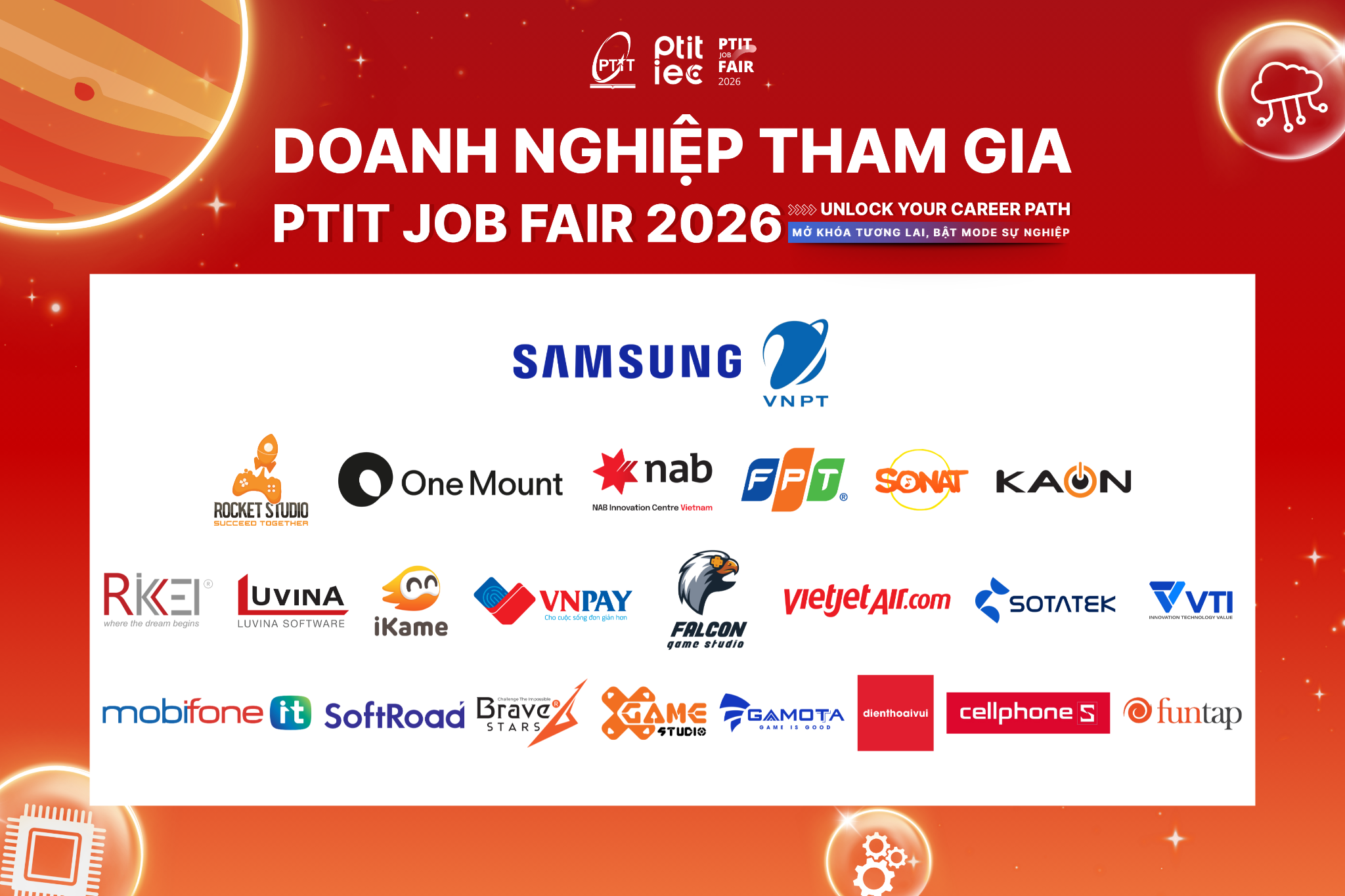 Đặc biệt, sự kiện Job Fair 2026 của Học viện được sự đồng hành của nhiều nhà tài trợ là các đối tác lớn trong và ngoài nước có truyền thống hợp tác sâu rộng với Học viện trong nhiều năm qua như như: Trung tâm Nghiên cứu và Phát triển Samsung Việt Nam (Samsung Vietnam R&D), Tập đoàn Bưu chính Viễn thông Việt Nam (VNPT), Tập đoàn FPT, NAB Innovation Centre Vietnam, One Mount Group, Sonat Game Studio, Rocket Game Studio và KAON Vietnam. Bên cạnh đó là sự tham gia tích cực của nhiều doanh nghiệp uy tín khác như iKame, Falcon, Appota (Gamota), Bravestars, Vietjet, VTI, VNPAY, Luvina, Rikkeisoft, SotaTek, SoftRoad, XGame, CellphoneS, Điện Thoại Vui, MobiFone và Funtap, góp phần tạo nên một hệ sinh thái kết nối việc làm đa dạng, năng động và giàu cơ hội. Sự đồng hành của các doanh nghiệp không chỉ góp phần nâng cao chất lượng và quy mô của chương trình, mà còn mở ra nhiều cơ hội việc làm, thực tập và hợp tác đào tạo thiết thực cho sinh viên.